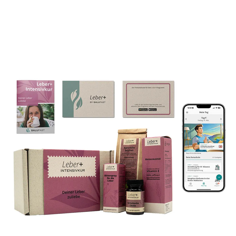 Ganzheitliche 14-Tage-Kur zur Leberunterstützung mit Bitterspray, Artischocke-Cholin Kapseln, Vitamin-E-reichem Weizenkeimöl und dem Bio-Kräutertee „Natürliche Reinheit“. In der App erhältst du leberfreundliche Rezepte, Aufgaben und tägliche Infos.