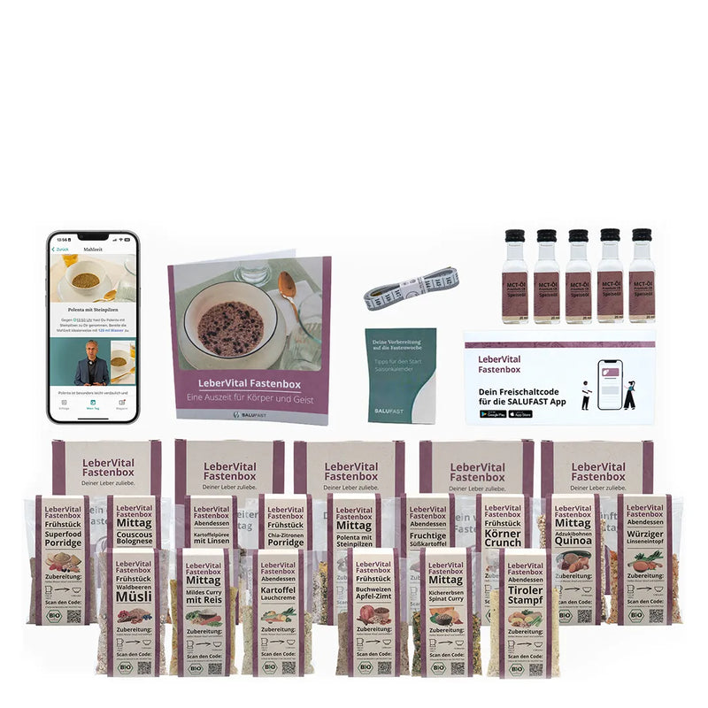 Seit Jahrtausenden wird Fasten als eine Methode der körperlichen und geistigen Erneuerung geschätzt. Salufast bringt diese jahrhundertealte Tradition mit der Fastenbox in die heutige Zeit. Unsere Scheinfasten Fastenbox, mit Einblicken von Experten wie Prof. Andreas Michalsen entwickelt, enthält alles, was du für eine Fastenwoche brauchst – von sorgfältig zusammengestellten Mahlzeiten bis hin zur unterstützenden App.
