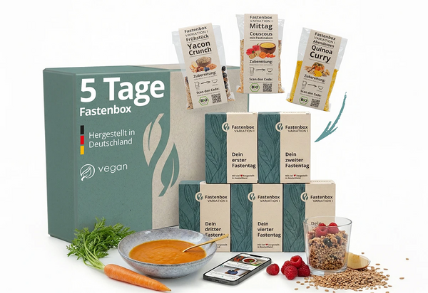Bereichere dein Fastenerlebnis mit unserer umfassenden 5-Tage Fastenbox Variation, die dir einen detaillierten Ernährungsplan und köstliche Mahlzeiten bietet, um die Autophagie zu fördern und das Wohlbefinden zu steigern.