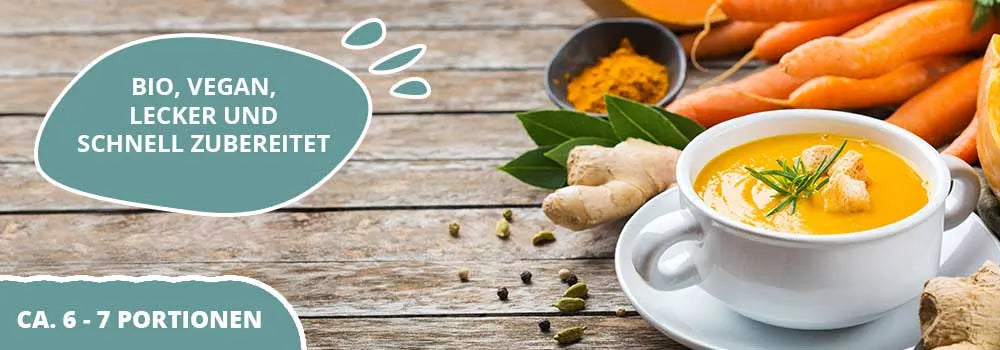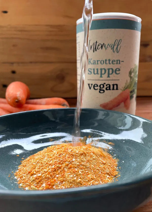 Kennst Du schon unsere Karottensuppe? Sie ist beliebt als leichtes und wohltuendes Essen am Abend, auf Reisen oder im Büro. Versorge Deinen Körper mit wichtigen Nährstoffen – ideal fürs Intervallfasten und eine vegane Ernährungsform. Die Suppe enthält keine Zusatz- und Konservierungsstoffe und ist vegan.