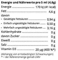 Das Omega+ Öl versorgt Dich täglich mit 20 µg (800 iE) Vitamin D3, was unglaubliche 400 % der Referenzmenge gemäß LMIV entspricht. Vitamin D3 trägt bei zu einer normalen Aufnahme von Calcium und Phosphor sowie zu einem normalen Calciumspiegel im Blut. Dies fördert die Erhaltung normaler Knochen und Zähne sowie einer normalen Muskelfunktion und Immunsystemfunktion.