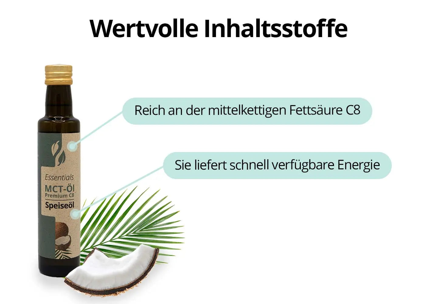 Unser MCT Öl Premium C8 wird aus hochwertigem Kokosöl gewonnen und enthält ausschließlich Caprylsäure (C8). Es wird ohne chemische Zusätze hergestellt und ist vollkommen rein, um höchste Qualität zu gewährleisten.