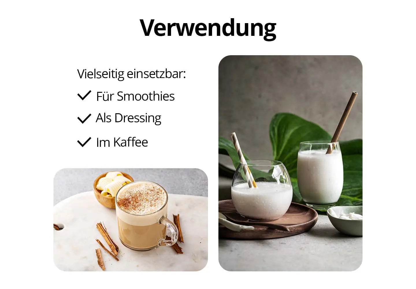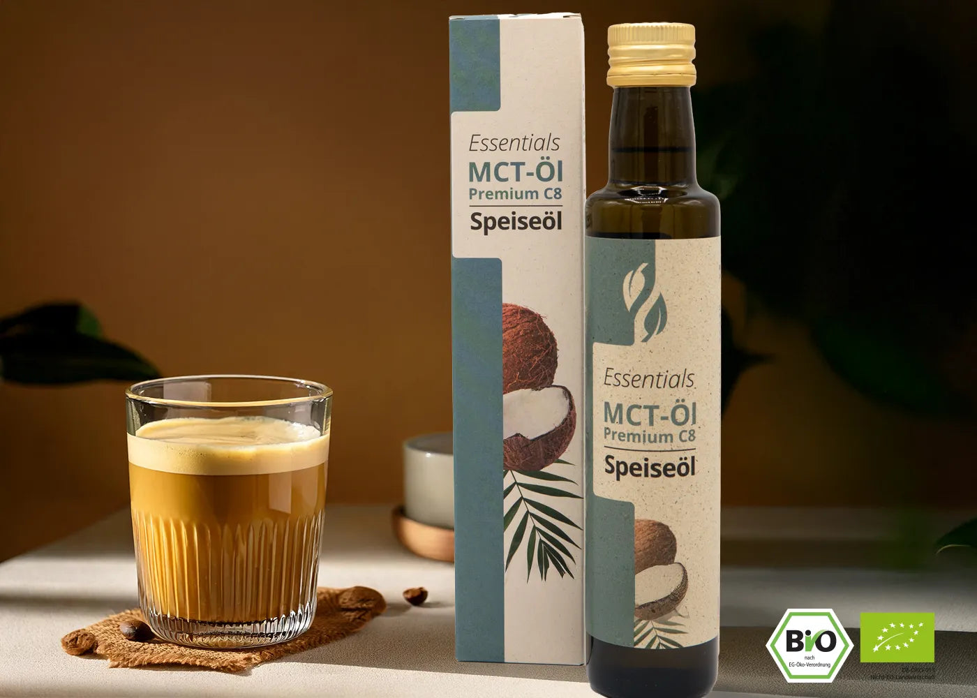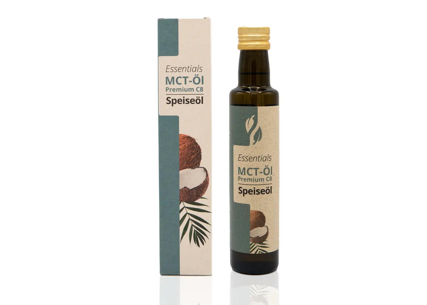 Unser MCT Öl Premium C8 besteht zu 100 % aus Caprylsäure (C8), einer mittelkettigen Fettsäure, die schnell in Energie umgewandelt wird und so den Körper auf natürliche Weise unterstützt. Es ist ideal für die ketogene Ernährung, für Smoothies, Salatdressings oder als Zugabe in Kaffee (Bulletproof Coffee). Da es völlig geschmacksneutral ist, passt es perfekt in die tägliche Ernährung, ohne den Geschmack der Speisen zu verändern.